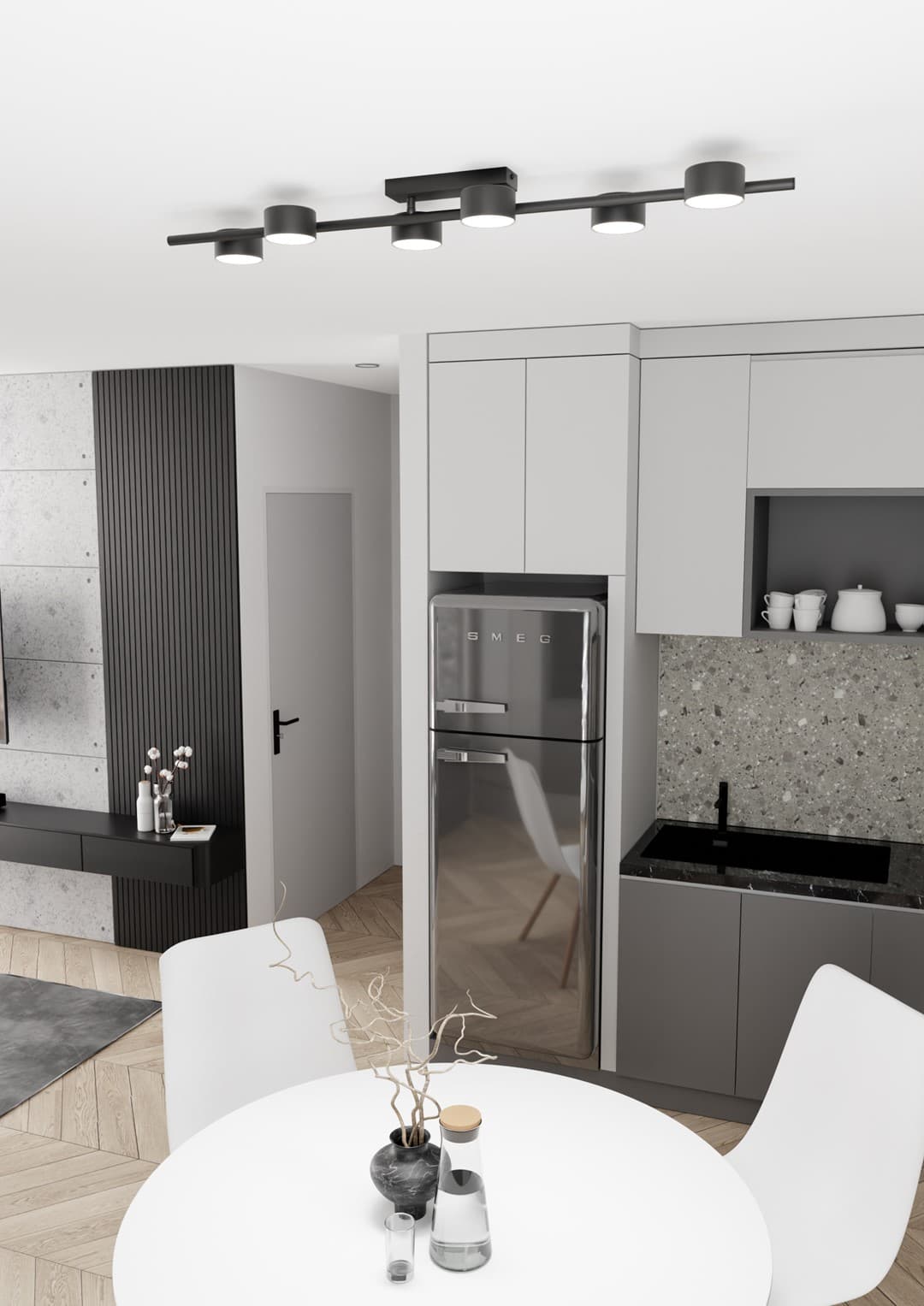 Stropna lampa BET je elegantan i moderan komad rasvjete koji se odlikuje minimalističkim dizajnom i funkcionalnošću. Njena struktura temelji se na horizontalnoj traci na kojoj je raspoređeno šest cilindričnih izvora svjetlosti. To osigurava ravnomjerno osvjetljenje, što je čini idealnom za dnevne sobe, kuhinje ili hodnike. Mat crna završna obrada dodaje moderan dodir, a njen kompaktni oblik čini je prikladnom i za potkrovlje i za skandinavske interijere.
